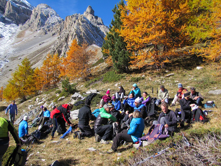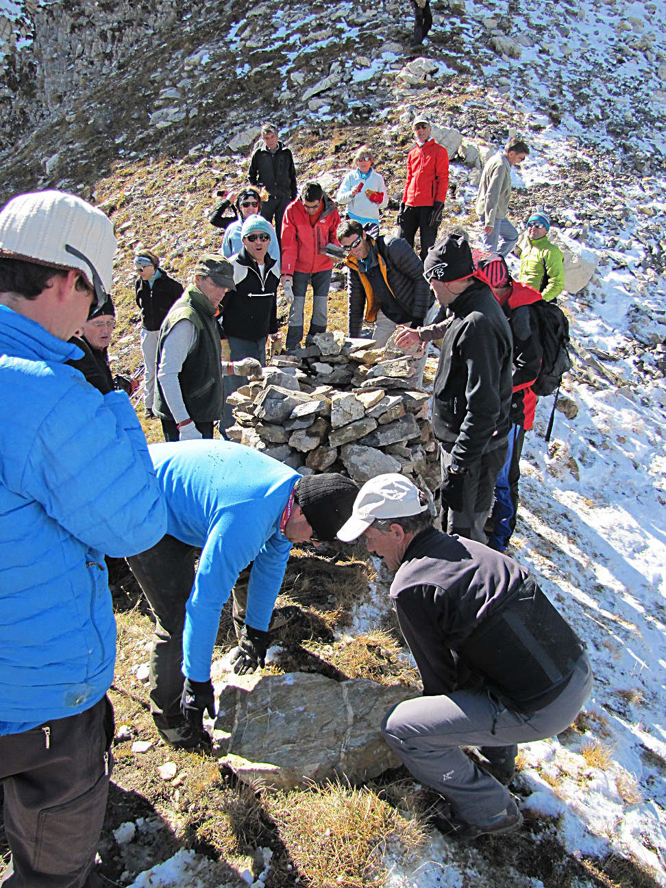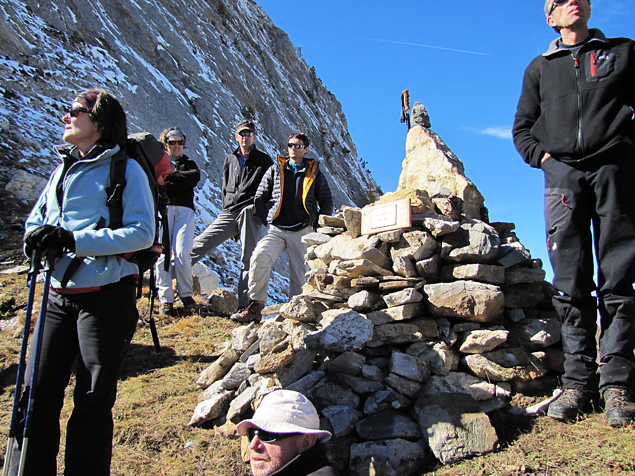 Il faisait beau, bon et la belle lumière d’automne magnifiait le paysage. Un peu de neige fraiche et d’innombrables nuances de roux sur les mélézins incitaient à une sorte d’enthousiasme esthétique. Alain était parmi nous à la fête. Pas de commémoration funèbre mais un rassemblement amical pour édifier un cairn symbolisant la vitalité de notre ami sur un site qu’il adorait. Nous avons choisi de construire un "Homme de Pierre" au collet 2453 sur la crête des Corays, rive gauche du vallon. Lieu stratégique et emblématique s’il en fut : ce collet est la porte de sortie de l’extraordinaire traversée du Pic des Veyres (Queyras/H21) qu’Alain avait réussie en mars 2011. Bien sûr, face à la combe secrète sous la Mamelle, lieu du drame, nous pensions tous à ce groupe de passionnés disparus, mais notre projet était de faire un cairn positif, utile, bien visible pour d’autres passionnés. Ceux traversant depuis les vallons du pas du Curé et de Lourette, ou ceux achevant, souvent au taquet, l’aventure de H21.