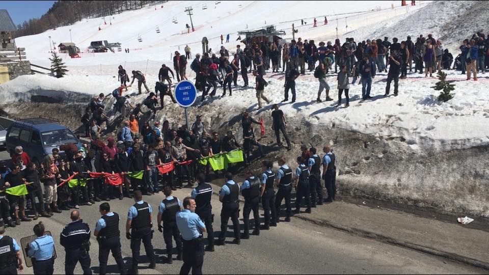 Dimanche 22/04. Et c’est bien ce qui s’est produit : sur ordre de la préfète Bigot-Dekeyser et du ministre Collomb, la gendarmerie n’a rien entrepris contre le groupe de nazillons (Génération Identitaire) au col de l’Echelle. En revanche comme le rapporte le Dauphiné Libéré, les forces de répression ont tenté de repousser plusieurs centaines de militants anti-fascistes italiens et français au col de Montgenèvre : le cortège a cependant réussi à franchir l’obstacle et accompagner des migrants jusqu’au Refuge Solidaire de Briançon. Préfète et Ministre annoncent aussi l’arrivée de renforts en provenance des départements voisins.