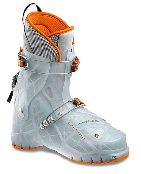 Garmont Master light (bleue translucide) 2160gr/paire en 26. Le principe de fermeture se distingue de tous les autres : c’est la formule portefeuille déclinée des chaussures de piste. La Garmont Light Rider (orange translucide) adopte le même système, est un peu plus rigide mais plus lourde avec un chausson classique et non thermo : à plus de 2,5kg/paire elle n’est pas retenue dans cet inventaire du "light".