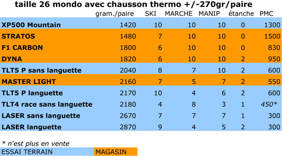 Toutes ces chaussures ont été pesées en taille 40 (mondo 26) et sont équipées de chaussons thermo légers (250 à 300 gr/paire). Nous donnons un PMC (prix moyen constaté).
