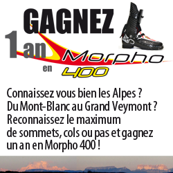 Depuis le 23 novembre, vous pouvez gagner une paire de chaussures de ski-alpinisme "Morpho 400" en carbone, fabriquée par la société Pierre Gignoux, en prêt pendant une année (ou bénéficier d’une remise de 50% sur l’achat de la même paire). Le jeu consiste à identifier des sommets et des cols des Alpes sur une photo panoramique.