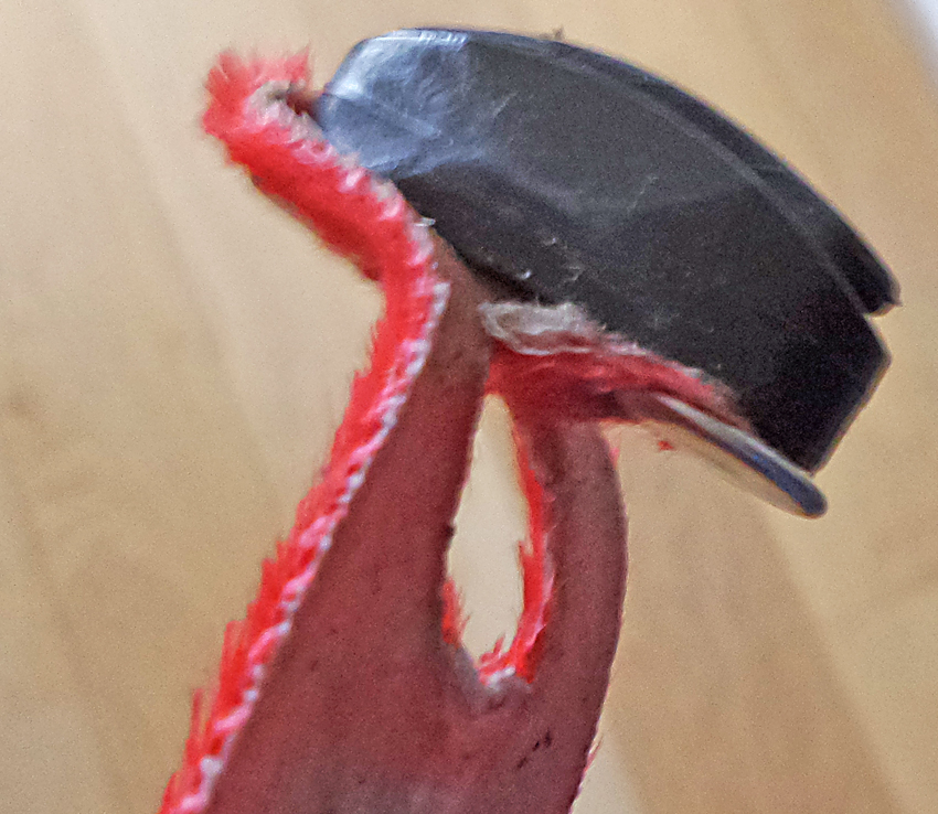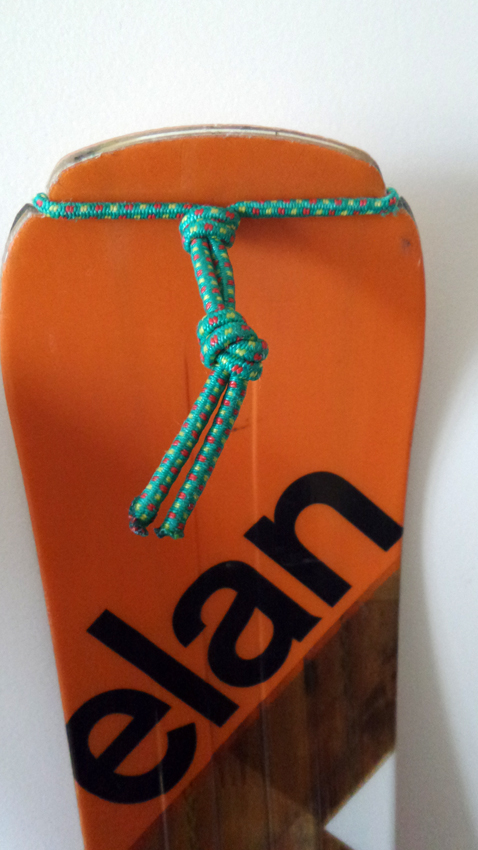 Beaucoup moins acrobatique est le déphoquage par l’avant (chaussures et fixations en position montée à verrouiller ensuite). Cette technique a été éprouvée depuis plus de 20 ans d’abord en compétition, puis en loisir. Trab l’a introduite sur ses derniers modèles avec deux accessoires avant et arrière mais bien fragiles (voir photo). La solution expérimentée en compétition avec un simple élastique (sur himalya, voir photo) est universelle et l’élastique acheté en grande surface de bricolage est INCREVABLE. Ce système nécessite seulement deux encoches en spatule que l’acheteur doit pour le moment faire lui-même avec une lime (queue de rat). Une demande légitime serait donc que TOUS les fabricants de skis de rando préparent ces encoches. Est-ce trop demander ?