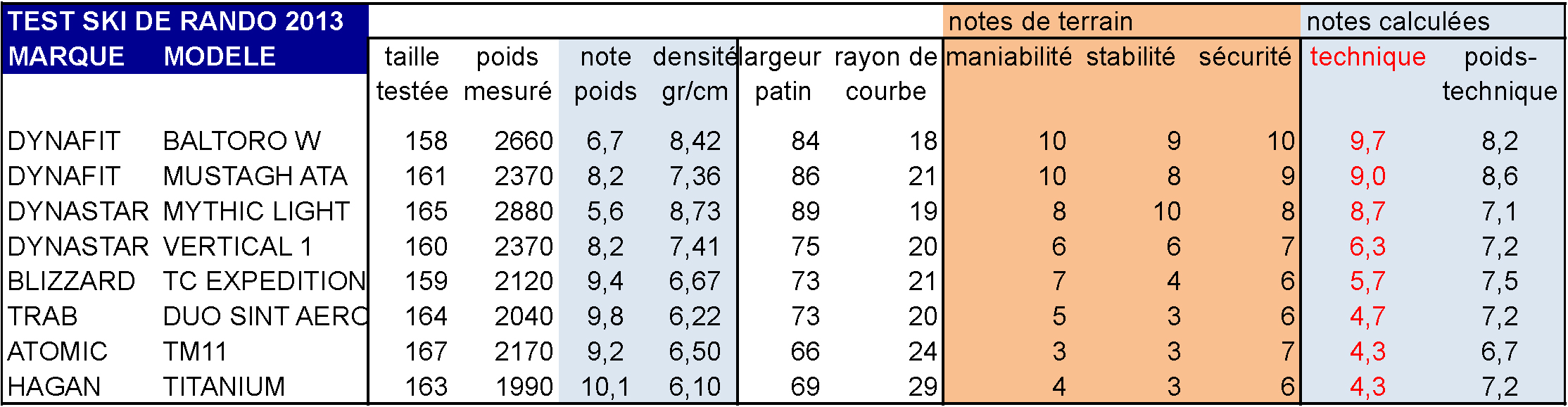 Le tableau récapitulatif conserve tous les skis du précédent. Certains ont bien vieilli mais conservent un intérêt pour certains usages et comme ski d’occasion pour débuter.