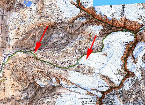 – sur la carte Haute Maurienne n° 237 de la série violette, éditée en 1977, les limites des glaciers sont les mêmes dans ce secteur que sur la carte reproduite (3633ET) éditée en 1997. J’ai acheté cette dernière très récemment (elle est dite "GPS compatible")