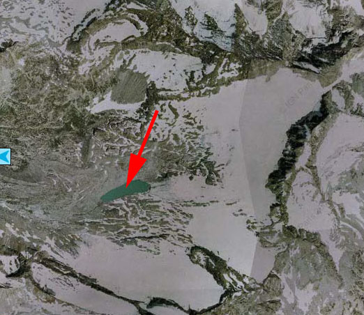 Vue aérienne de Geoportail de 2002, la flèche montre un grand lac glaciaire à 2800 m d’altitude.