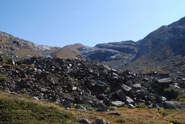 Photo prise devant la moraine de dépose frontale limite du glacier lors de la fin du petit âge glaciaire (1900), altitude 2100 m,