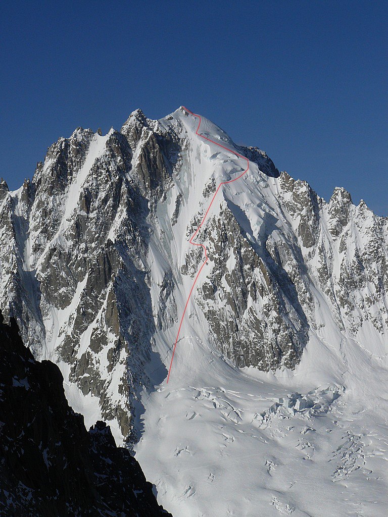 Jeudi 25 avril 2013, les deux compères ont remonté puis descendu la ligne en Z qui borde à droite le couloir Couturier à la Verte. Comme nous l’a dit Vivian, bien que plus technique que le Couturier, elle a l’avantage de permettre de skier la face nord de l’aiguille Verte sans rappel. "Ca fait plusieurs années que la neige ne colle pas dans l’étroiture et c’est pour cela que le "Z" que dessine notre ligne (dans les cailloux ) est très intéressant !"