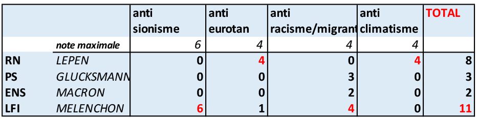 Divergences. Le ski ne se modifie pas en cours de test alors que le politicien peut changer d’avis comme de chemise mais sans vraiment tromper son monde. Alors que les trois catégories utilisées dans le ski test sont de valeur égale, j’ai ici privilégié le facteur dominant, le sionisme noté sur 6 alors que les autres notes sont sur 4.