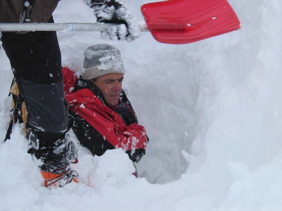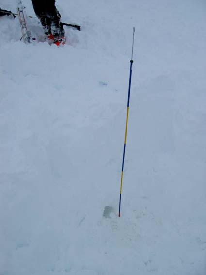 L’arva analogique de Lionel (orthovox F1) trouve son maxi et le maxi de mon numérique (barryvox) confirme. Nous cherchons encore pendant une minute un signal plus fort ; il ne vient pas ; nous nous regardons "il est quelque part sous nos pieds". Je sors la sonde en cerclant autour du point max. Partout elle s’enfonce en entier, c’est à dire de 2m50, en touchant du dur (la terre ou la glace ?), puis sur un point et un seul elle s’arrête à 160cm. La sensation est très dure " j’espere que c’est pas un caillou" dis-je à Lionel. Il faut prendre une décision. Après une brève hésitation, nous acceptons le triple verdict des deux arvas et de la sonde. Celle-ci reste plantée et comme c’est profond nous commençons le terrassement d’un cratère de 3m de diamètre.