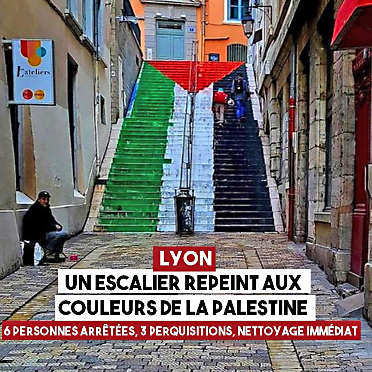 Aujourd’hui l’écolo se plie à nouveau aux demandes sionistes en faisant immédiatement le ménage sur un escalier peint aux couleurs palestiniennes. Article