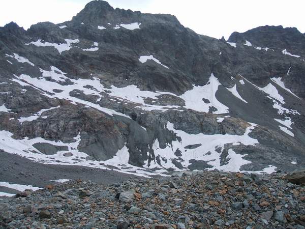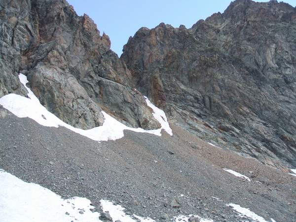 Le couloir sud du col de Verdonne (course E6.1 - Ecrins sud par LTA et LVO ) est lui aussi touché par le retrait des glaces : très étroit et raide (45-50° par endroit ce jour), nous l’avons remonté moyennant quelques passages en rocher. Toujours selon le gardien, le meilleur compromis en ski comme en alpinisme semble être la fin du printemps de manière à profiter de l’ouverture de la route et de bénéficier des restes d’avalanches qui épargnent un pierrier infâme de plus de 1000m de D+.