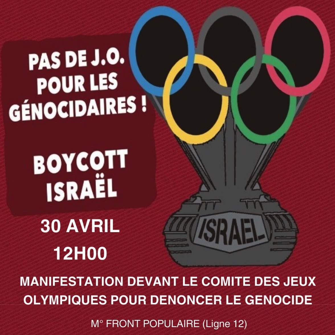 A J+96 La présence de l’état génocidaire aux prétendus " Jeux Olympiques" du 26 juillet n’est toujours pas remise en cause par le régime qui les organise. Le président Macron n’a même pas prévu de faire concourir les SS (soldats sionistes) sous " bannière neutre" avec les arguments issus de son inculture géopolitique. On peut s’attendre à un "en même temps" avec son pote Netanyahou consistant à priver de jeu quelques brebis galeuses ayant paradé devant leurs victimes. Ce qui est donc en cause c’est le pays hôte qui collabore, militairement, économiquement, culturellement et donc aussi sportivement au génocide.