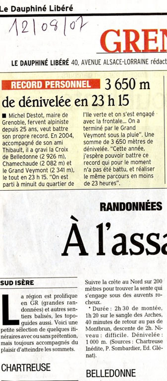 Tout en haut de la page, dans un à-plat jaune immanquable, l’info-choc dans laquelle on peut lire que Michel Destot veut améliorer son temps de 2004, " ce record qui pour le moment n’a pas été battu " déclare fièrement le maire de Grenoble. [2] Il n’est cependant pas dit comment les liaisons ont été faites entre les trois sommets (croix de Belledonne, Chamechaude et Grand Veymont) gravis en 23 h 15. D’où trois hypothèses.