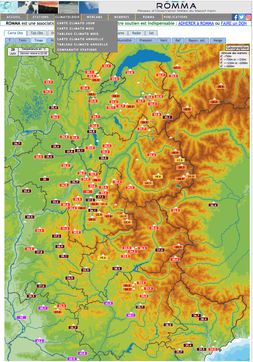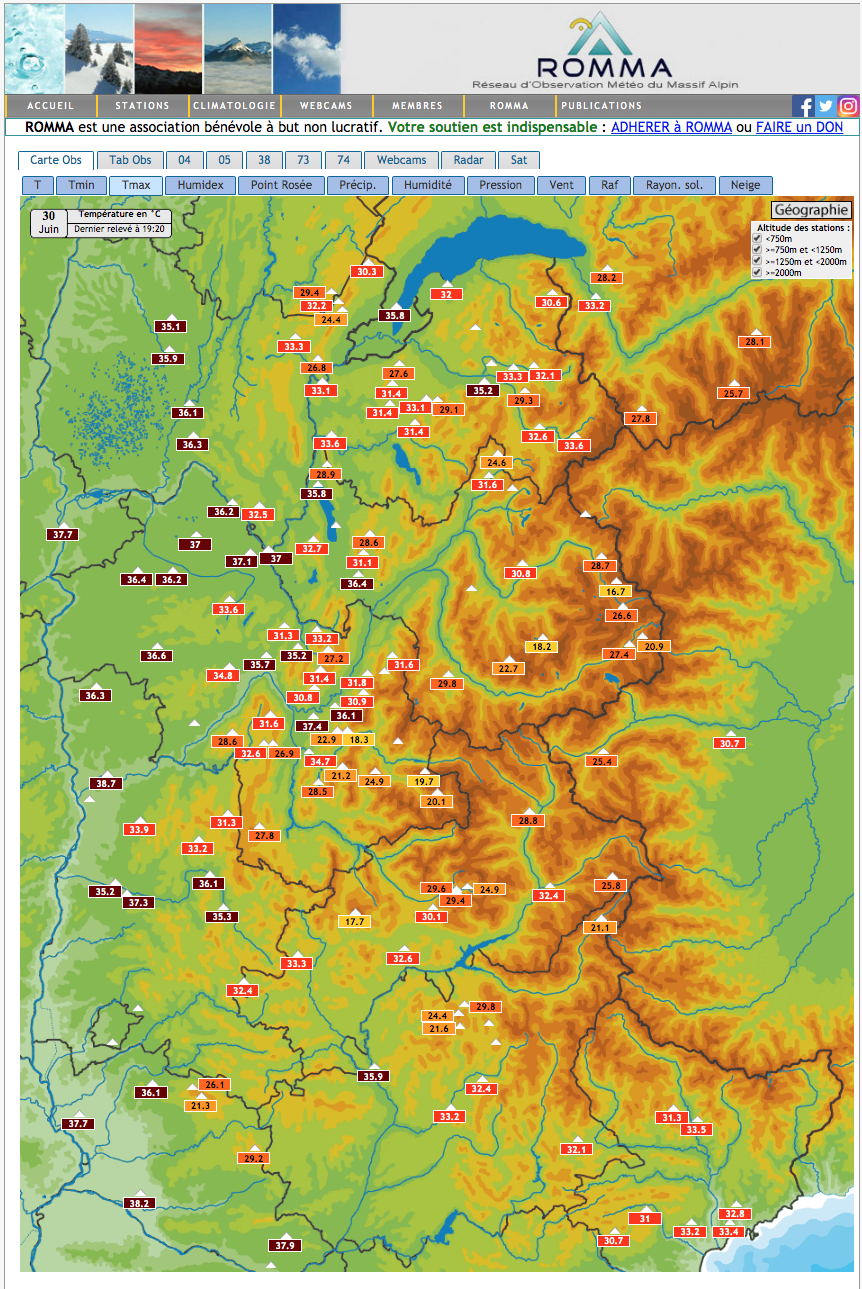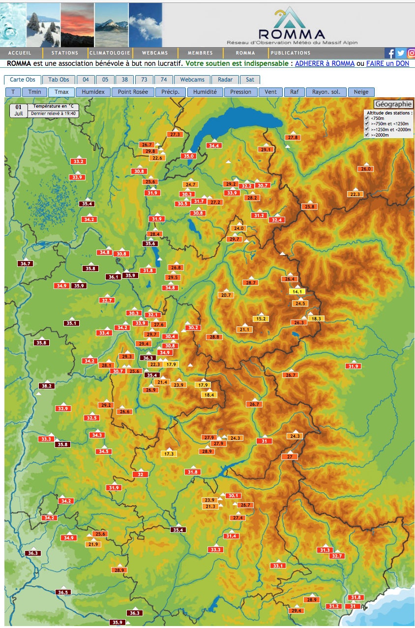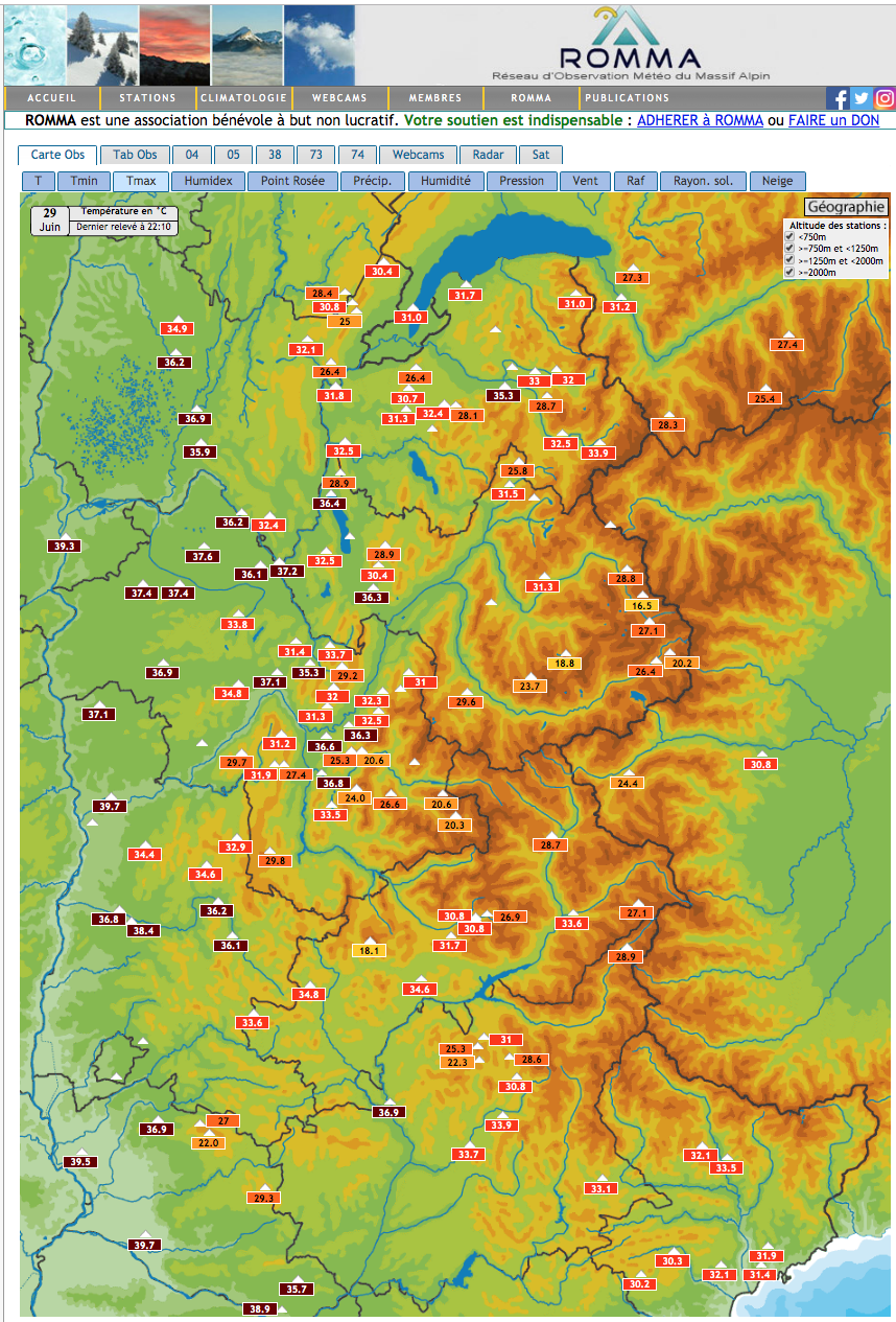 Pour conserver une trace de l’épisode qui vient de s’écouler, ces quelques copies des températures maximales ont été faites sur le site ROMMA chaque jour après 20h00 du 28/06/2019 au 01/07/2019. Elles portent sur le quart sud-est de la France.