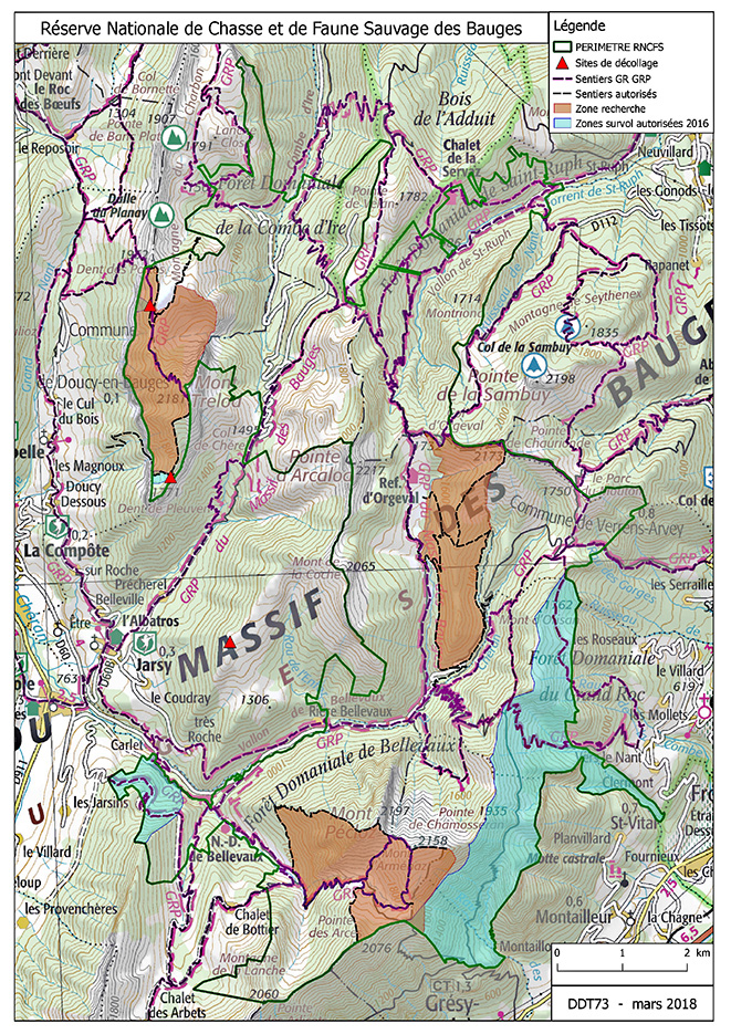 La reconduction de la Réserve Nationale de Chasse et Faune Sauvage des Bauges (RNCFS) (nota 1) par arrêté interdépartemental DDT/SEEF n° 2018 – 1135 du 23 Aout 2018 des préfets de Savoie et Haute-Savoie instaure une nouvelle réglementation. Ci-dessous extrait de l’article définissant l’accès du public.