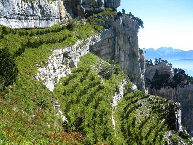 La magnifique faiblesse de la puissante barrière orientale de la Chartreuse, autorisant le passage des hommes et des bêtes vers l’étage supérieur des prairies, du sentier du Paradis (!) offre surprise et émotion, au sortir de la forêt depuis le col de Marcieu, comme au débouché de la vire supérieure si la découverte se fait par le haut :