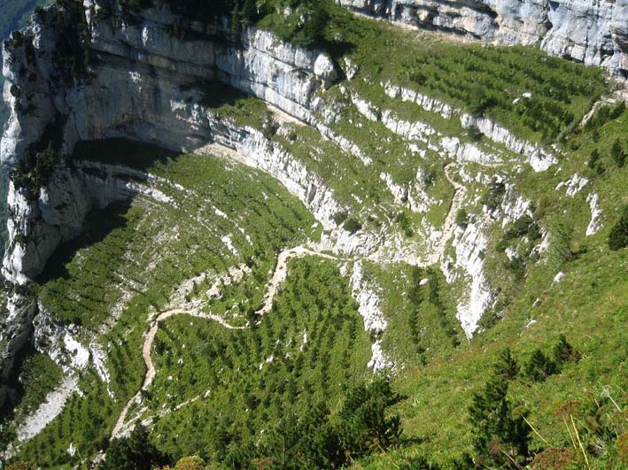– une improbable architecture de vires herbeuses en redents dans lesquelles le sentier serpente avec modestie et ténacité,