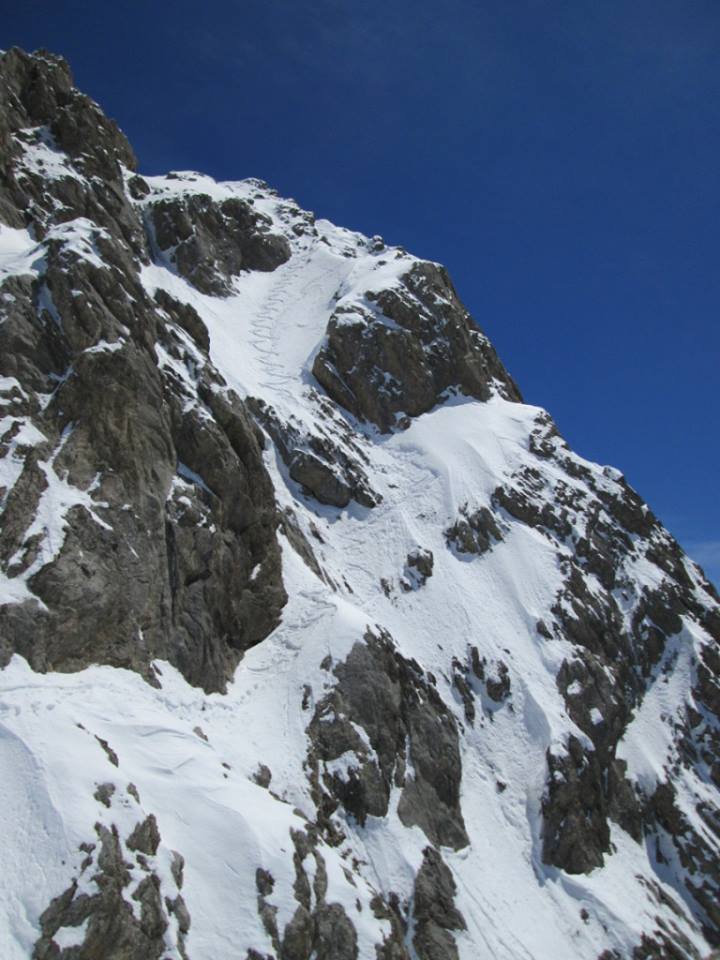 Pierre Lombard était une des figures emblématiques de la vallée de l’Ubaye. Il gardait un gîte à Larche et était d’excellents conseils. Décédé en 2008, il avait skié en 2001 la face sud de la Meyna située juste au-dessus de son gîte. Le 27 mai 2013, Giorgio Bavastrello a ouvert une nouvelle ligne en snowboard sur ce 3000 m de la vallée, cette fois dans la face nord. Joint aujourd’hui par messagerie instantanée, Giorgio cote cette descente 5.3/E4 avec 200m supérieurs autour de 50° et des passages à 55°. La partie basse est plus facile avec 400 m à 40-45° mais cela fait tout de même 600 m de face ! La neige abondante et collante de cette fin de saison a permis le plaquage des rochers sommitaux et a rendu cette descente possible. Encore une bien belle réalisation dans les Alpes du sud. Avec élégance, Giorgio a appelé cette voie la voie "Pierre Lombard".