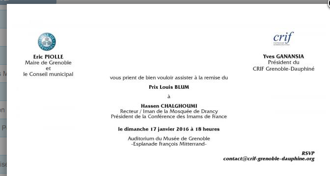 Une nouvelle fois le maire de Grenoble, Eric Piolle s’est livré à une opération de communication en faveur du régime d’Apartheid qui sévit en Palestine. Le prétexte cette fois a été une invitation le 17 janvier 2016 par la section grenobloise du CRIF, qui n’est rien d’autre qu’un Conseil Représentatif d’Israel en France . Pour faire bonne mesure ils n’avaient pas trouvé mieux que de faire intervenir l’imam Chalghoumy, familier des génuflexions auprès des sionistes. Pour s’en convaincre, voir l’interview de cet "imam" sur le blog De Grenoble à Gaza"