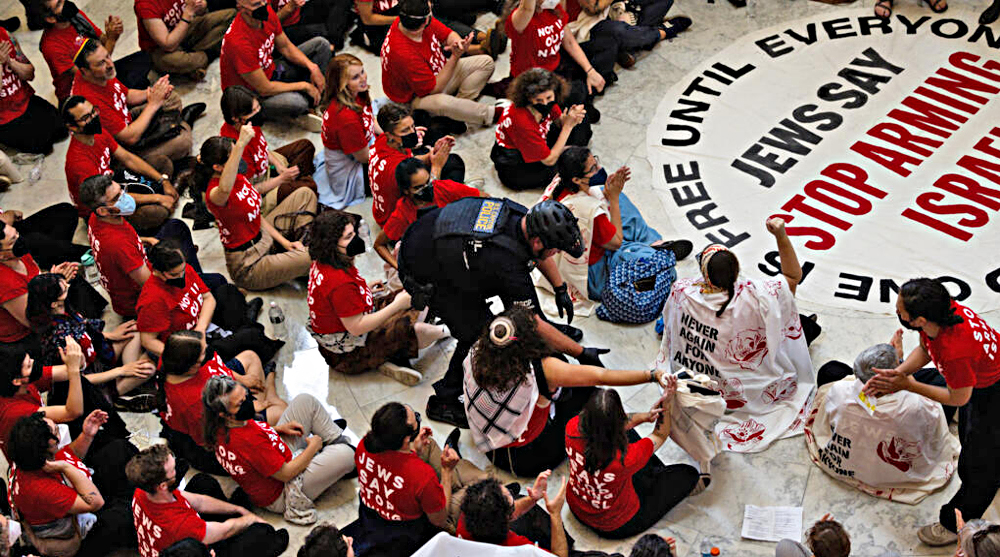 Devant le capitole une importante manifestation de juifs anti-sionistes a été organisée contre la visite du criminel prétendant s’exprimer en leur nom, avec plusieurs centaines d’arrestations.