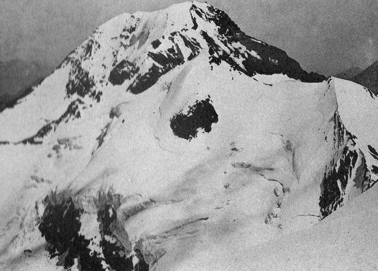 " Pour faire suite à l’article de Francois Pebay sur le recul glaciaire en Vanoise, voici une photo des Ciamarella et de la pointe Tonini, prise depuis les pentes est (ou sommet) de l’Albaron, en 1895 (source : revu CAF de Lyon).