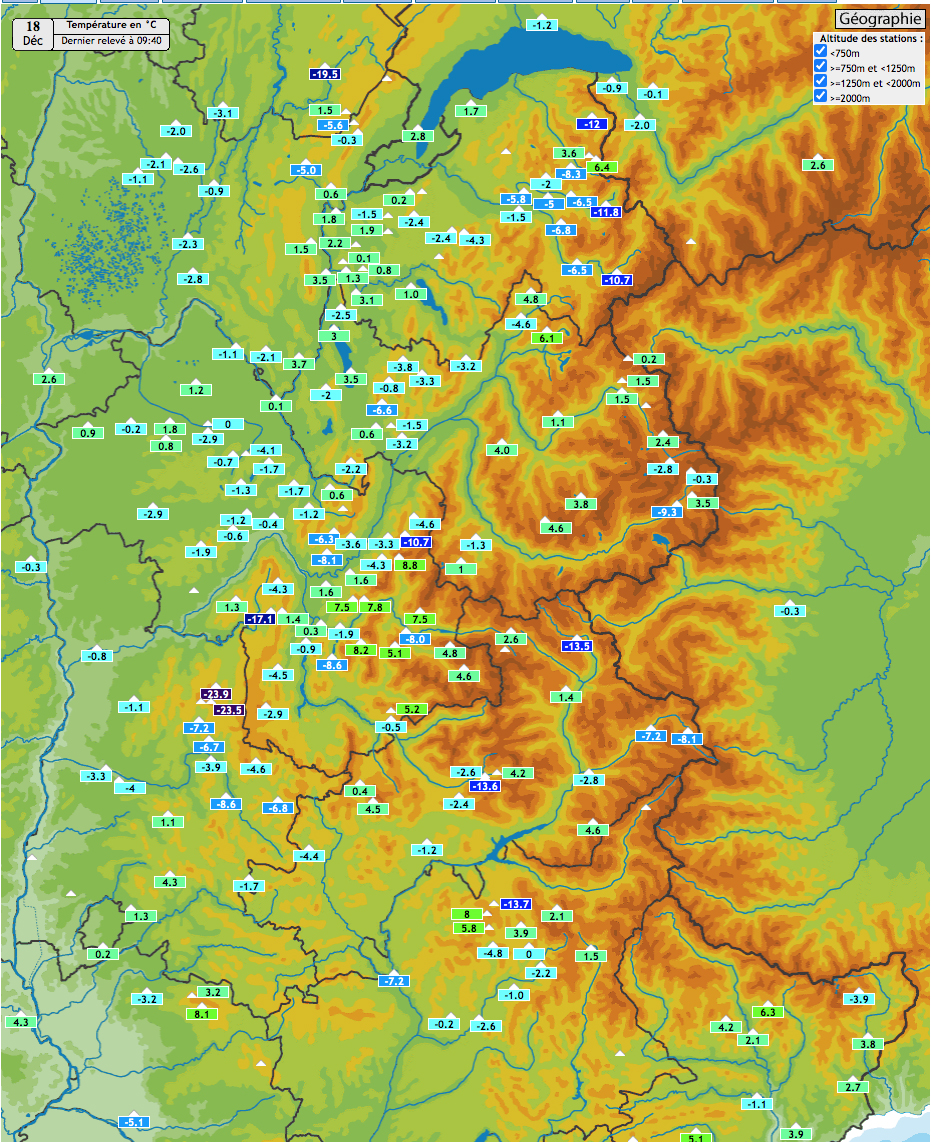 Inversion au 18/12 . Elle s’est poursuivie voire accentuée avec ce relevé Romma qui signale -24° à la Chapelle (1000, Vercors), -14° à Selonnet (1060, Hte Provence), -19,5° à Saint-Claude (840, Jura). A l’opposé les minimales nocturnes étaient de - 0,3 au Pisaillas (3100, Vanoise), +2,5° au plateau de Bure (2550, Dévoluy).
